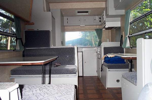 Le bus est pour 6 personnes avec douche et WC ainsi que 4 plaques à gaz et un four micro-ondes, hôte de ventilation et frigo 12Volt et 220 Volts